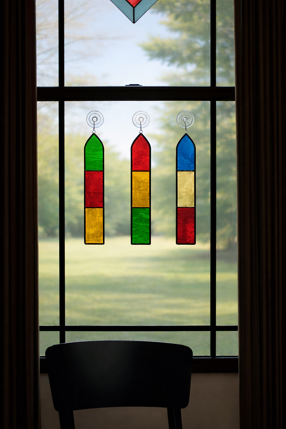Timeless, antique stained glass jewel normally meant for stained glass windows, but made into an exquisite pendant! This pendant has a flat back and is made with lead free solder. Dark patina is applied and polished for a delicate shine. Hangs from an antique 18" dark steel chain. Please contact for custom length chains. Absolutely gorgeous in any light.